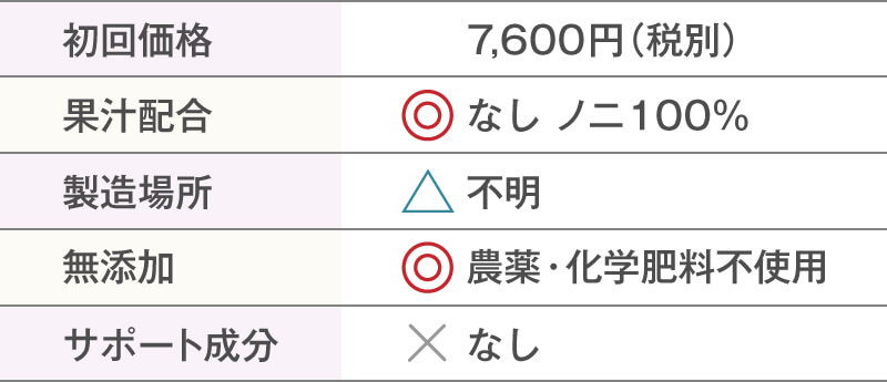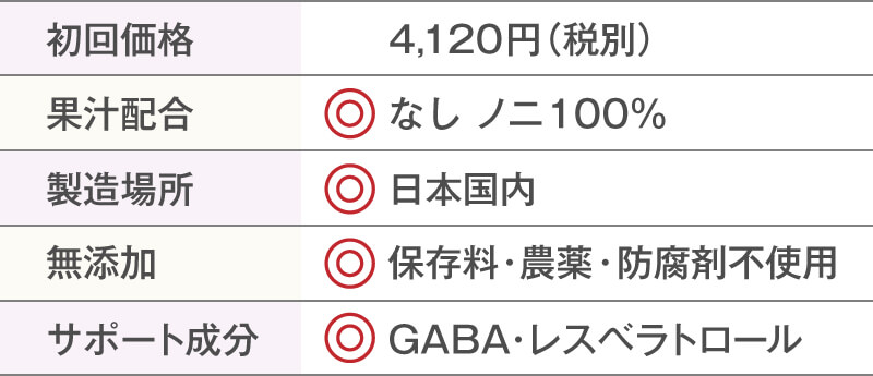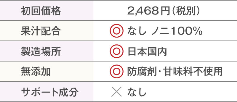 国内製造・無添加への配慮など安心感あり初回は4,120円(税別)でお試しすることができます。ノニジュースのなかでは中程度の価格帯ですが、とてもこだわりが感じられる商品なので、品質を考慮すればかなりお買いお得です。