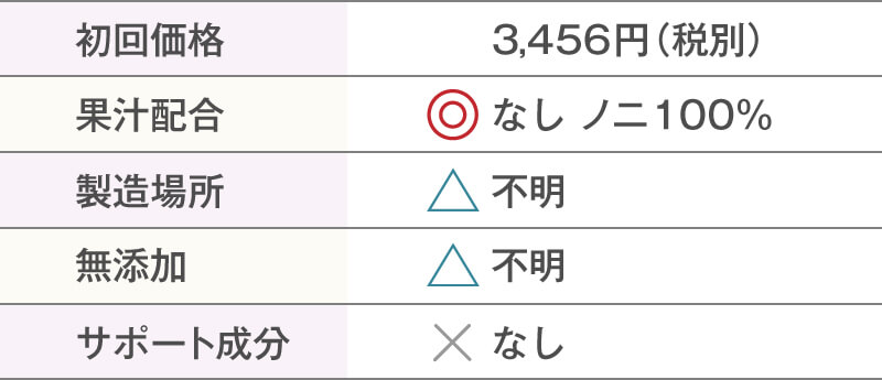 製造地や添加物については不明価格は5,300円(税込)と若干高めの部類に入ります。味を美味しく整えているため、どうしてもノニジュースが苦手な方は金額を考慮しても飲む価値はありそうです。